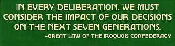 Long-term thinking concerning consequences is a critical component to ecologically responsible policy and behavior. Short-term satisfaction of our desires often leads to detrimental long-term consequences for the ecological community. Given our advances in science and technology and our increased ability to manipulate and affect the environment on a grand scale, it is particularly important to guide our science and technology with wisdom that incorporates a view of the long-term consequences of our action. Such a view is expressed in the Iroquois wisdom of thinking about the effect of our actions on seven generations into the future.
