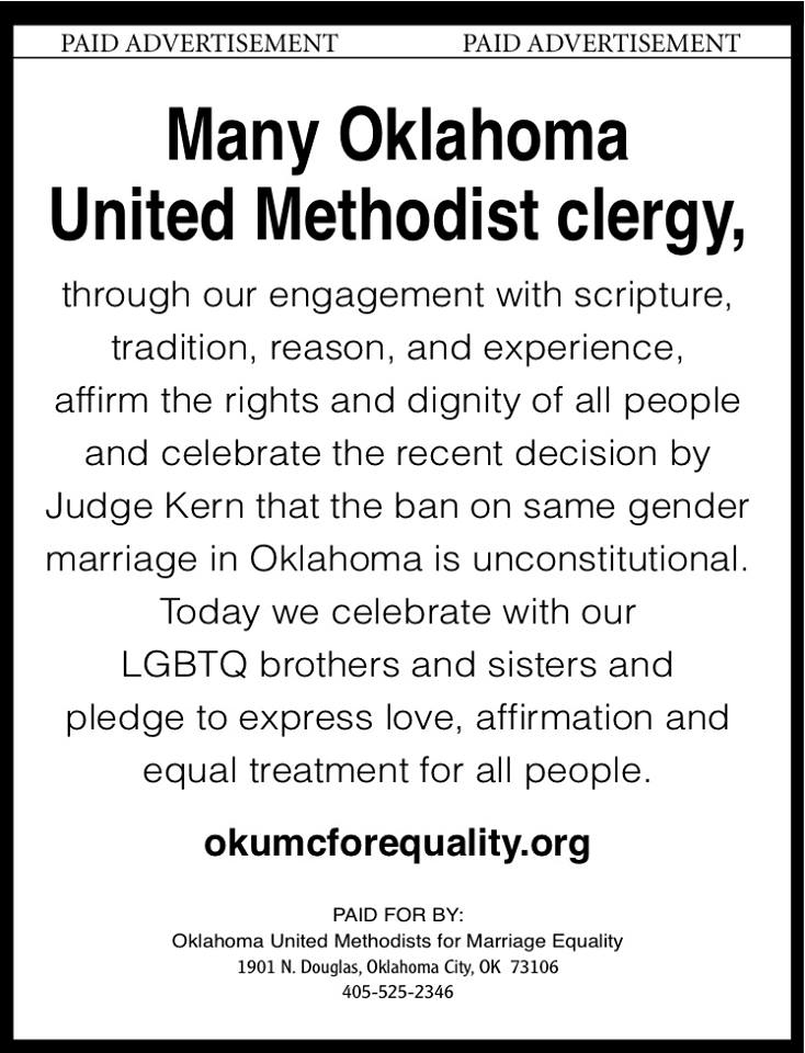 “MANY OKLAHOMA UNITED METHODIST CLERGY, THROUGH OUR ENGAGEMENT WITH SCRIPTURE, TRADITION, REASON, AND EXPERIENCE, AFFIRM THE RIGHTS AND DIGNITY OF ALL PEOPLE AND CELEBRATE THE RECENT DECISION BY JUDGE KERN THAT THE BAN ON SAME GENDER MARRIAGE IN OKLAHOMA IS UNCONSTITUTIONAL. TODAY WE CELEBRATE WITH OUR LGBTQ BROTHERS AND SISTERS AND PLEDGE TO EXPRESS LOVE, AFFIRMATION, AND EQUAL TREATMENT FOR ALL PEOPLE.”