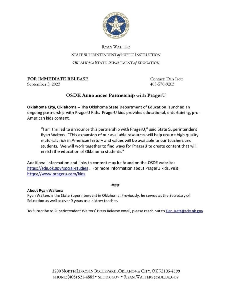In addition to developing a partnership with PragerU, Oklahoma is also testing precedents set by the Supreme Court of the United States concerning the establishment of religion by agreeing to use public education funding for a Catholic online education program that will be promoting Catholic religious teachings to its students.