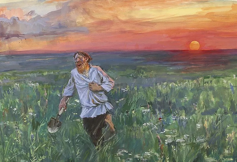 Pahom learns that the Bashkirs (a Turkic ethnic group indigenous to Russia) are selling large amounts of land at a very low price, but there is a condition to claiming the land. He can only claim the amount of land that he can circumnavigate by foot between sunrise and sunset. Pahom is so driven to claim as much land as he possibly can in one day that he walks such a great distance that he collapses and dies at sunset just as he completes his arduous journey.